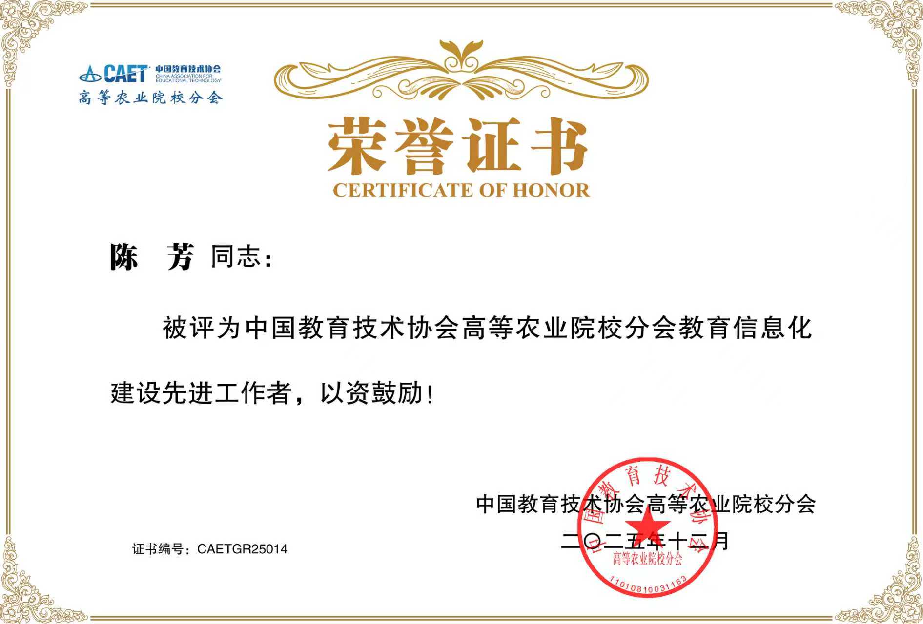 同时,信息中心副主任陈芳获评“中国教育技术协会高等农业院校分会教育信息化建设先进工作者”,表彰其在推动信息化规划落地、保障网络信息安全、服务师生需求及促进教育技术应用研究等方面的突出贡献。