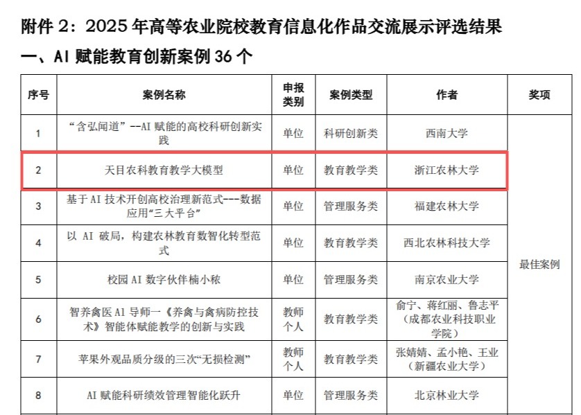 学校牵头研发的“天目农科教育教学大模型”荣获“AI赋能教育创新案例最佳案例”。该模型立足农林学科特色,探索人工智能与专业教育深度融合,在课程资源智能化建设、个性化学习推荐、虚拟仿真教学等方面展现创新价值,为涉农高校教育教学模式革新提供“浙农林”方案。